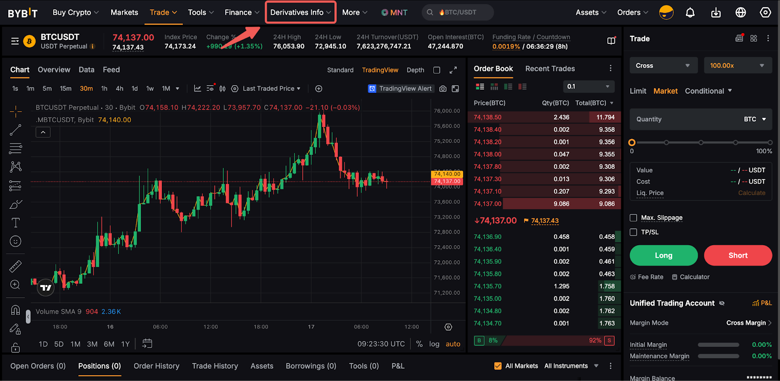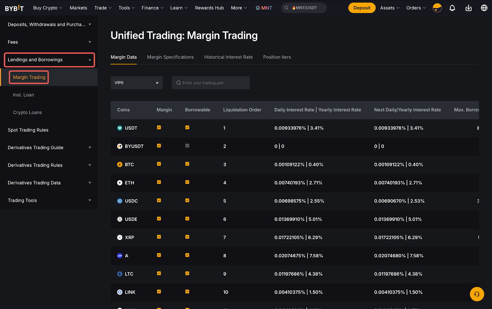 لعرض تفاصيل الأصول الضمانية والقابلة للاستدانة، انتقل إلى صفحة تداول المشتقات وانقر على معلومات المشتقات. ثم، انقر على الإقراض والاقتراضالتداول بالهامش بيانات الهامش. ستتمكن من رؤية الأصول الضمانية والقابلة للاستدانة المدعومة مع ترتيب السيولة ومعدل الفائدة.