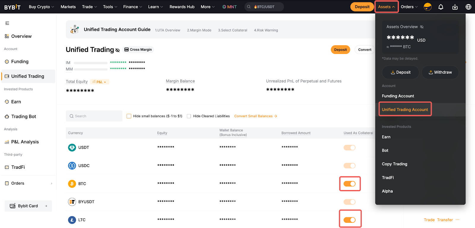لتخصيص إعدادات الضمان، حرك المؤشر إلى علامة التبويب الأصول وانقر على حساب التداول الموحد. قم بالتبديل بين تشغيل وإيقاف لتخصيص الأصول لتُستخدم كضمان.