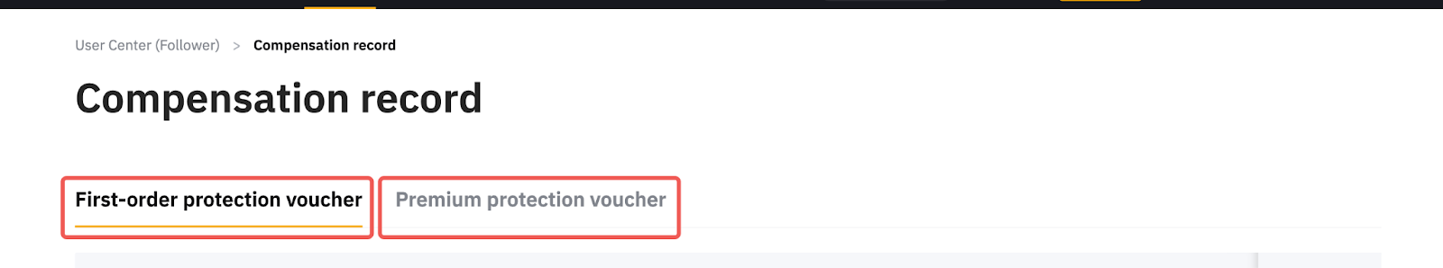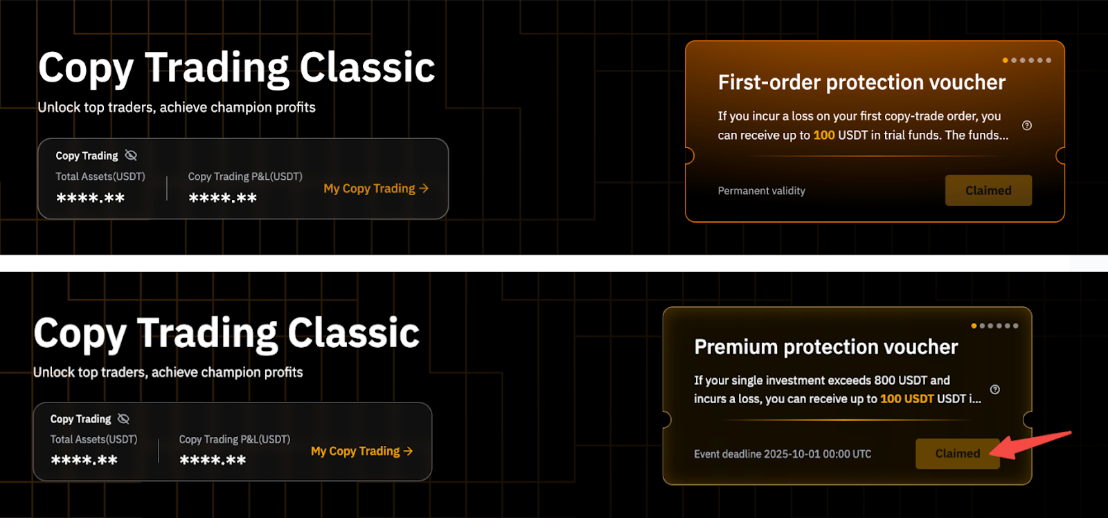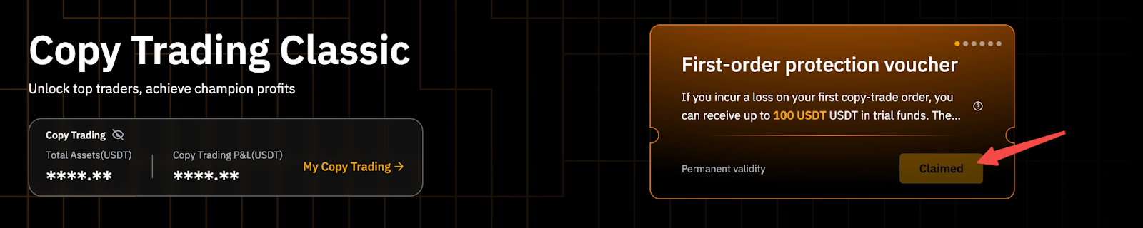 - قسيمة الحماية المميزة: يمكن المطالبة بها مرة واحدة كل ربع سنة في الزاوية اليمنى العليا من التداول بنسخ الكلاسيكي أو تداول TradFi. خلال نفس الربع، أنت مؤهل للحصول على تعويض يصل إلى 100 USDT عن الخسائر الناتجة عن تاجر محترف مؤهل واحد. يمكن استخدام هذه الميزة مرة واحدة في كل ربع.