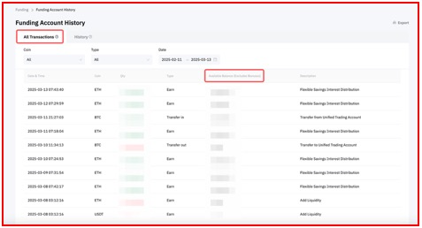 تسمح لك علامة التبويب التاريخ بعرض جميع تاريخ معاملات الأصول الخاصة بك بناءً أساسًا على الأنواع والطرق التي تتلقى أو ترسل بها الأصول المدارة الخاصة بك. تشمل هذه الفئات إيداعات وسحوبات العملات المشفرة/النقود الورقية، التحويلات، الشراء بنقرة واحدة، التداول من نظير لنظير، الحساب الفرعي، العائد، ومعاملات بطاقة Bybit.