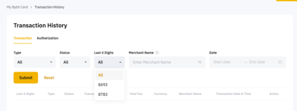 عرض تاريخ المعاملات لبطاقة Bybit الخاصة بك