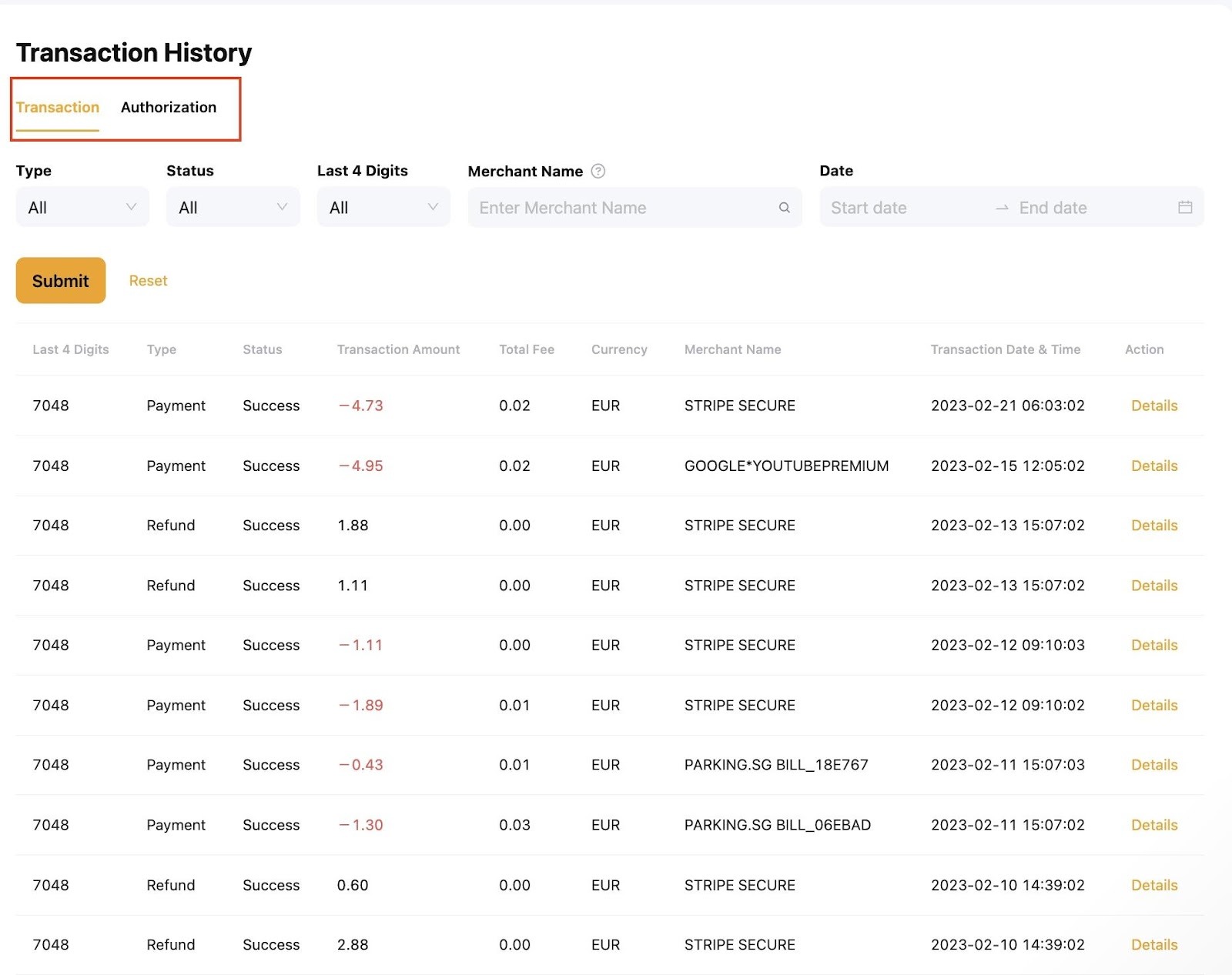 الخطوة 2: في صفحة سجل المعاملات، يمكنك عرض تفاصيل معاملاتك تحت العمليات و التفويض. يمكنك استخدام أنواع التصفية أدناه للعثور على سجلات المعاملات التي ترغب في عرضها بدقة أكبر. ثم، انقر على إرسال.