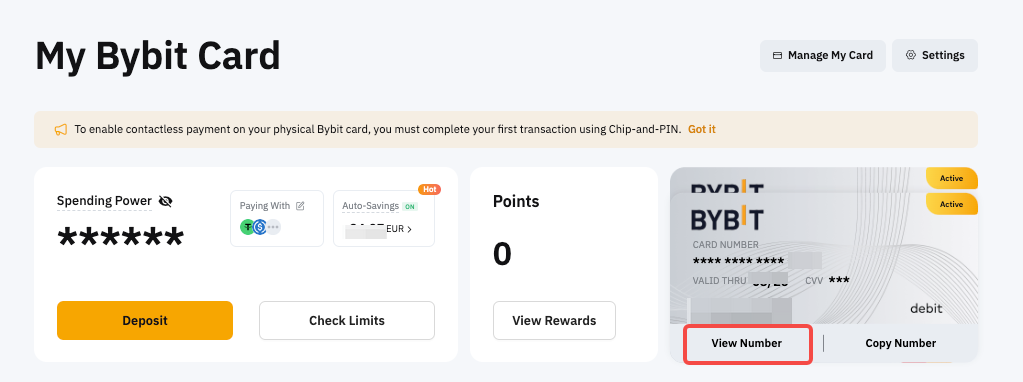 لعرض تفاصيل بطاقة Bybit الخاصة بك، يمكنك الذهاب إلى بطاقتي Bybit والنقر على عرض الرقم. إذا كان لديك أكثر من بطاقة Bybit واحدة، ببساطة اضغط على عرض البطاقة لتبديل البطاقات.