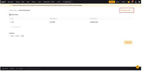 لتحسين استخدام الأصول الصغيرة في حسابك على Bybit، يمكنك تحويل أي أصول تقل قيمتها عن 0.001 BTC أو ما يعادلها إلى MNT، USDT، أو USDC في عملية تحويل واحدة باتباع أربع خطوات بسيطة. يدعم تحويل الأرصدة الصغيرة باستخدام كلاً من حساب التمويل وحساب التداول الموحد (UTA). يرجى ملاحظة أن تحويل الرصيد الصغير يقتصر على مرة واحدة كل ساعة واحدة.