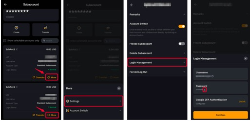 c. لتأمين الوصول إلى حسابك الفرعي، يمكنك تمكين ميزة طلب كلمة مرور لتسجيل الدخول وملء اسم المستخدم و كلمة المرور لحسابك الفرعي الجديد مباشرةً. سيتم استخدام اسم المستخدم للحساب الفرعي على المنصة لتحديد حسابك الفرعي ولتسجيل الدخول. لاحظ أن اسم المستخدم لا يمكن تغييره بعد إنشاء الحساب الفرعي.