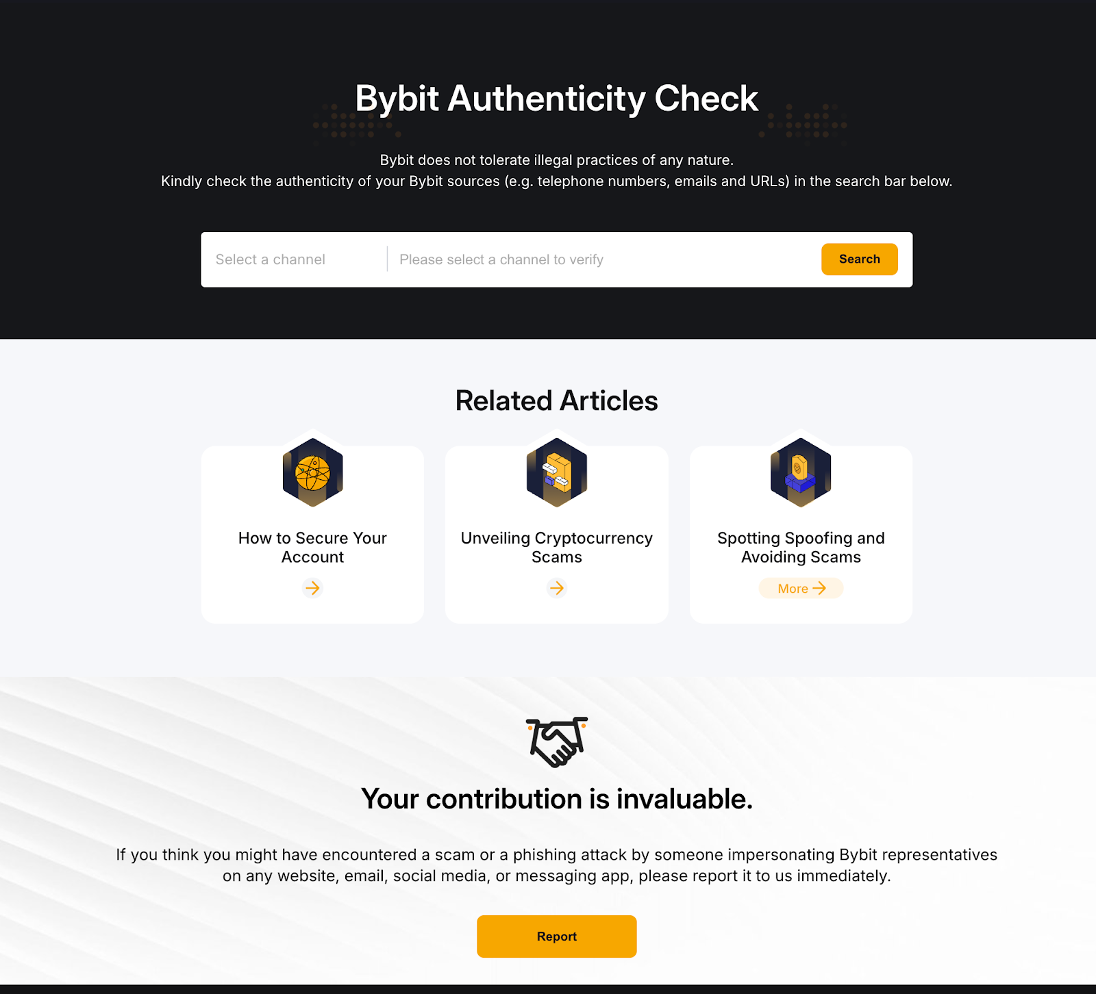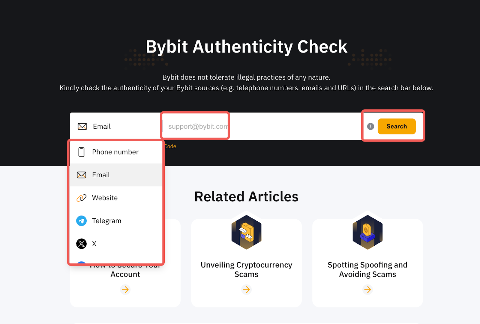 يمكنك بسهولة التحقق مما إذا كانت المصادر من Bybit باستخدام Authenticity Checker للتحقق من صحتها. ما عليك سوى تحديد نوع القناة وملء التفاصيل للحصول على النتيجة.