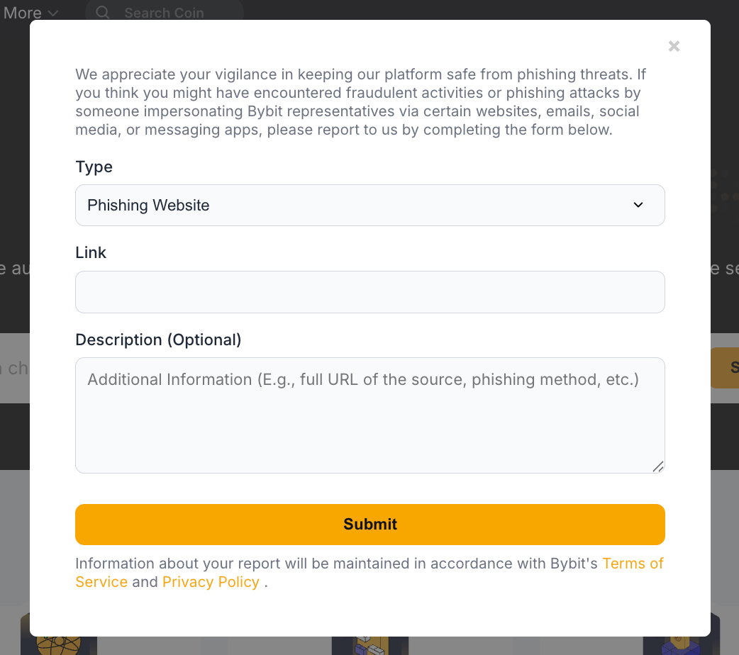 إذا كنت تعتقد أنك قد واجهت عملية احتيال أو هجوم تصيد احتيالي من قبل شخص ينتحل شخصية ممثلي Bybit على أي موقع إلكتروني أو بريد إلكتروني أو وسائل تواصل اجتماعي أو تطبيق مراسلة، فيُرجى تنبيهنا بإحدى الطرق التالية: