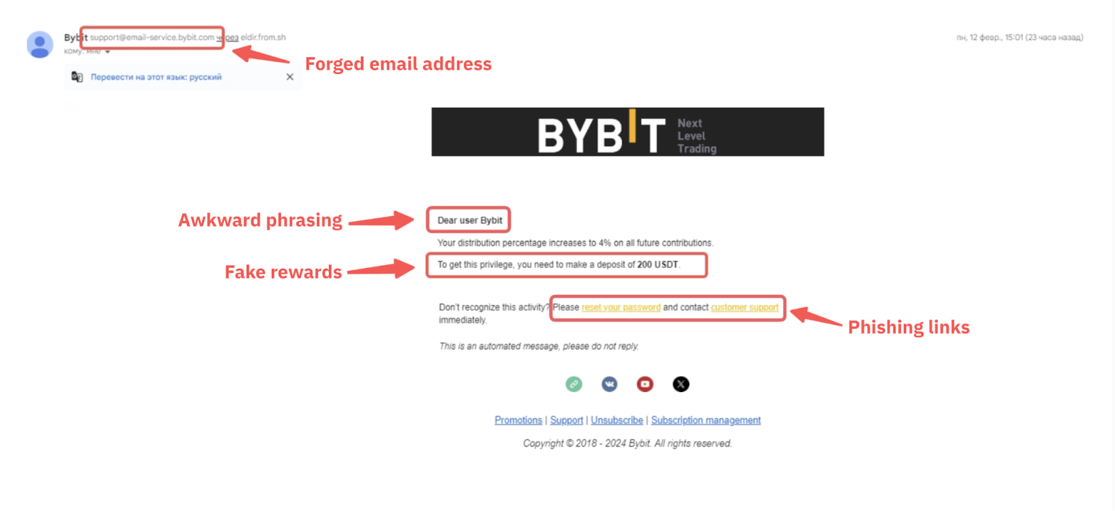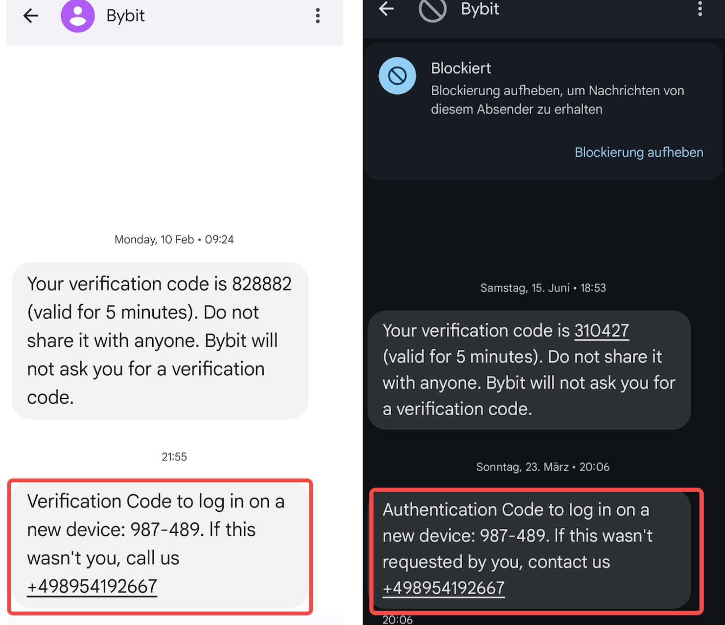 في محاولة للظهور كاتصال شرعي، تستخدم المخططات أحيانًا معرّفات مرسلين مزيفة لإخفاء المرسلين الأصليين في رأس الرسائل القصيرة. وهذا يعني أن هذه النصوص الخادعة قد تظهر حتى في نفس سلسلة المحادثة التي تظهر في الرسائل الرسمية السابقة لBybit.