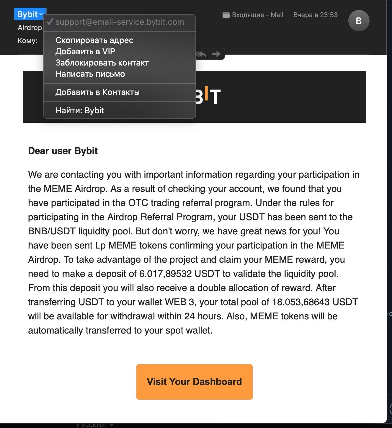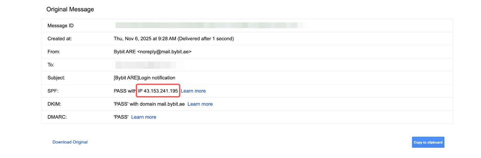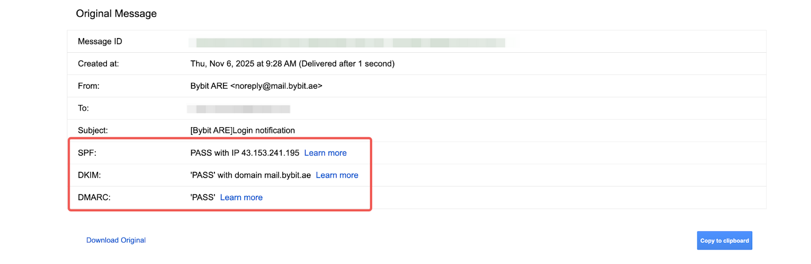 كما ذُكر أعلاه، حتى إذا كانت نتيجة التحقق رسمية، يمكن بسهولة تزوير معلومات الاتصال الخاصة بالمرسل باستخدام تقنيات الانتحال. فيما يلي مثال نموذجي يوضح كيف يقوم المحتالون بإخفاء عناوين البريد الإلكتروني للمرسل وتزويرها لطلب أصول من مستخدمي بايبت.