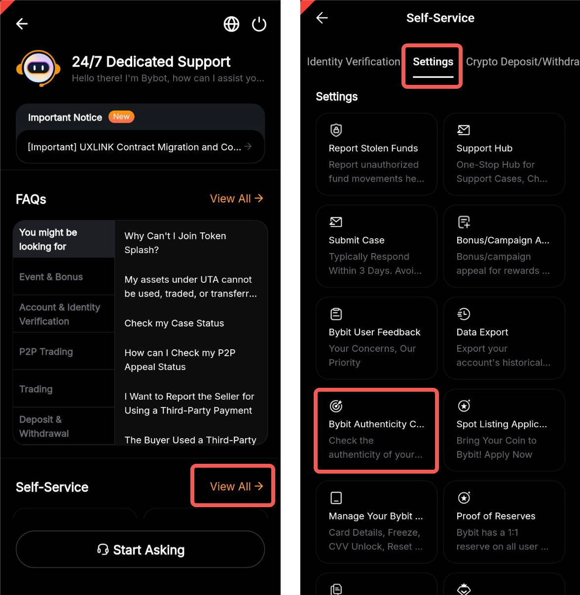 يمكنك التحدث إلى دعم العملاء مباشرةً عبر المحادثة المباشرة أو ببساطة ملء هذا النموذج باستفسارك، وسيحضر فريقنا المتخصص حالتك. يمكنك تقديم الوثائق الداعمة (على سبيل المثال، لقطات الشاشة، وTXIDs، وما إلى ذلك) للمساعدة في عملية التحقيق والمراجعة.