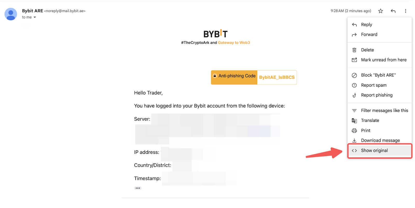 يُرجى النقر فوق علامة القطع (ثلاث نقاط) في الزاوية العلوية اليمنى من بريدك الإلكتروني، ثم حدد إظهار الأصل. ستتم إعادة توجيهك بعد ذلك إلى صفحة تحتوي على تفاصيل عناوين بريدك الإلكتروني.