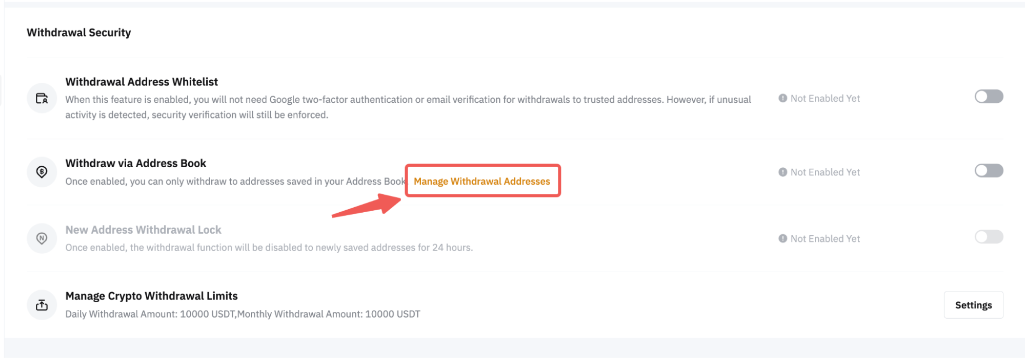 For swift and convenient withdrawals, Bybit has several security features to help you maintain and update your withdrawal address book. These features give you the options to adjust your current withdrawal settings as well as verify and delete any withdrawal addresses, if needed.