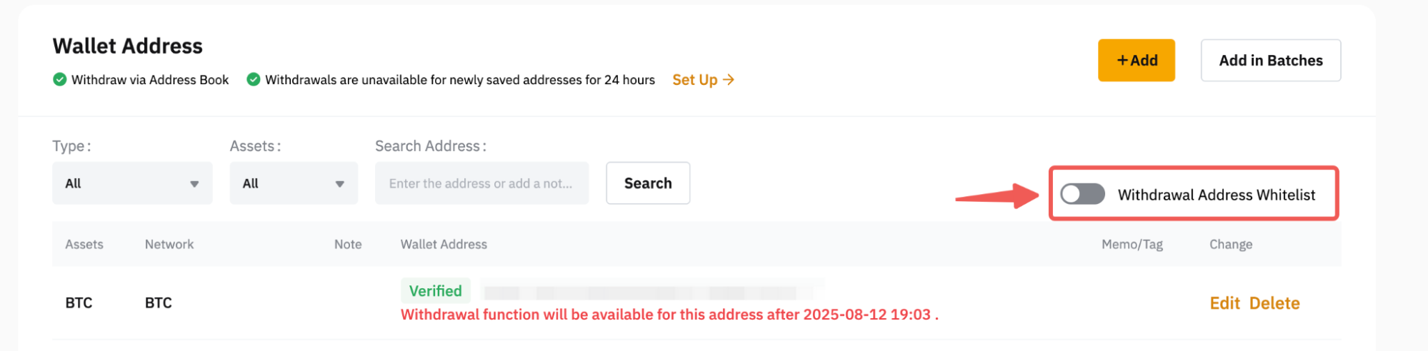 Once the withdrawal address has been verified, you can whitelist the address by toggling the Withdrawal Address Whitelist option. Doing so will allow you to make a withdrawal without having to complete the email and 2FA security verification process.