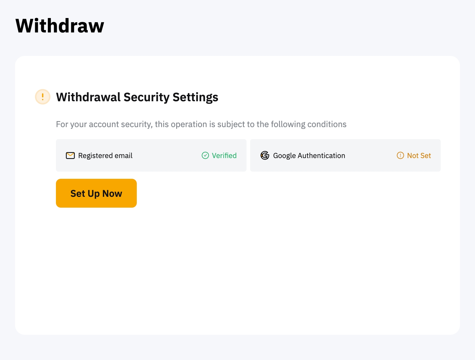 You can access and modify your withdrawal settings via the Wallet Management page by clicking on the Set Up button. You will then be redirected to the withdrawal security functions on the Account page, where you can toggle the options you would like to enable or disable.