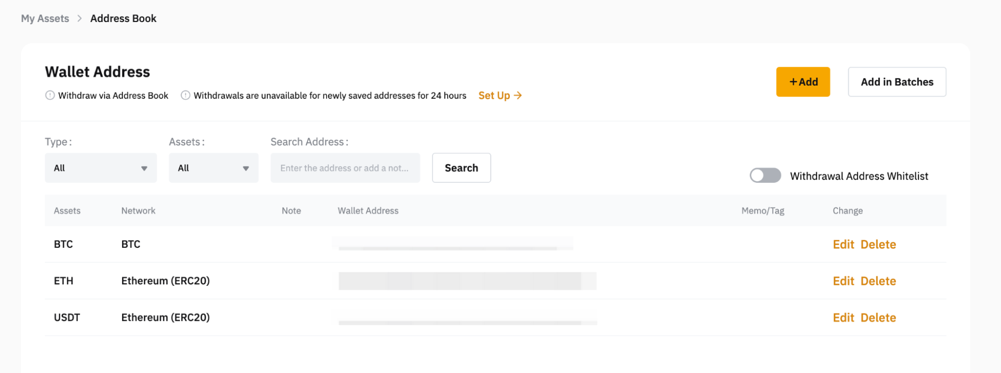 1. Once you’re on the Wallet Management page, please click on the Add button at the top right corner of the page to add a new wallet address. If you would like to add several addresses at the same time, please click on Add in Batches.