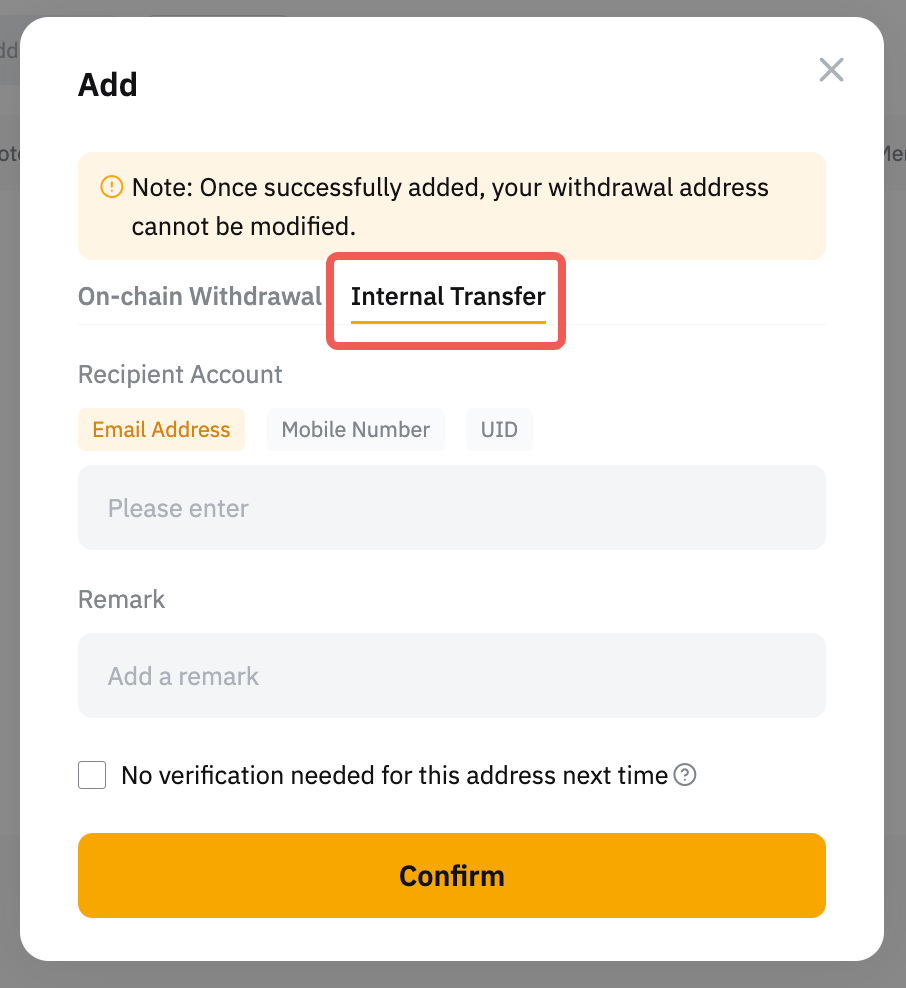 If you would like to add an Internal Transfer account, simply enter your email address, mobile number, or UID of the Bybit account to which you would like to withdraw.