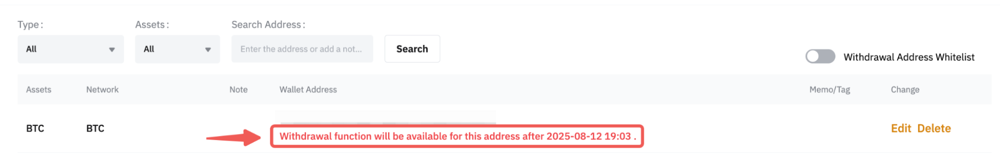 If you have activated the New Address Withdrawal Lock security feature, for example, the withdrawal function will be restricted for 24 hours for the newly saved address or when you disable the security feature.