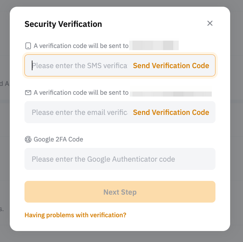 الخطوة 3: سيطلب منك إكمال عملية التحقق الأمني. اضغط على أزرار إرسال رمز التحقق المختلفة لاسترجاع الرموز المرسلة إلى هاتفك المحمول الحالي وعنوان بريدك الإلكتروني. بمجرد إدخالك للرموز التحقق المطلوبة وكذلك رمز التحقق من Google 2FA، اضغط على الخطوة التالية.