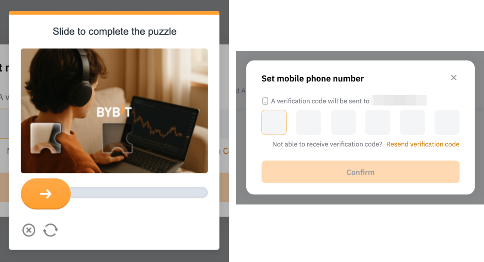 الخطوة 3: أكمل التحقق التفاعلي من كابتشا. ثم، سيتم إرسال رمز تحقق جديد إلى رقم هاتفك لربط هاتفك المحمول بحسابك على Bybit. أدخله في النافذة المنبثقة وانقر على تأكيد.
