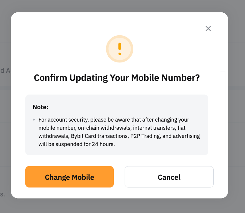 الخطوة 2: ستظهر نافذة تأكيد، تخطرك مسبقًا بأنه سيكون هناك قيود على الخدمات لمدة 24 ساعة لسحب العملات الرقمية والفيات، التحويلات الداخلية، معاملات بطاقة Bybit، التداولات والإعلانات على P2P بعد تغيير رقم هاتفك المحمول. بمجرد فهمك، اضغط على تغيير الهاتف المحمول للمتابعة.