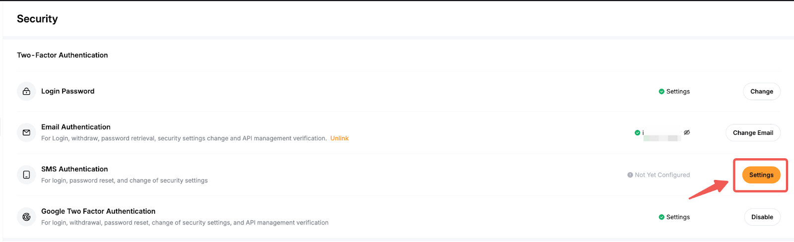 الخطوة 1: انتقل إلى صفحة الأمن واضغط على زر الإعدادات، تحت المصادقة عبر الرسائل القصيرة، كما هو موضح أدناه.