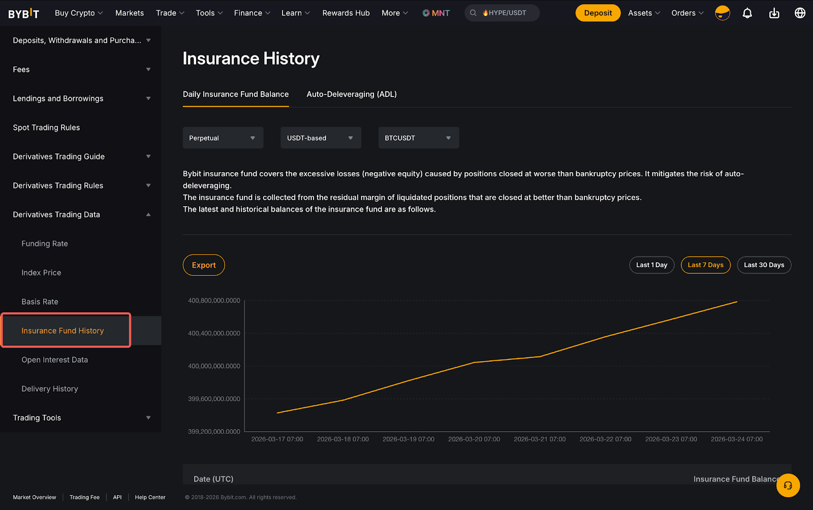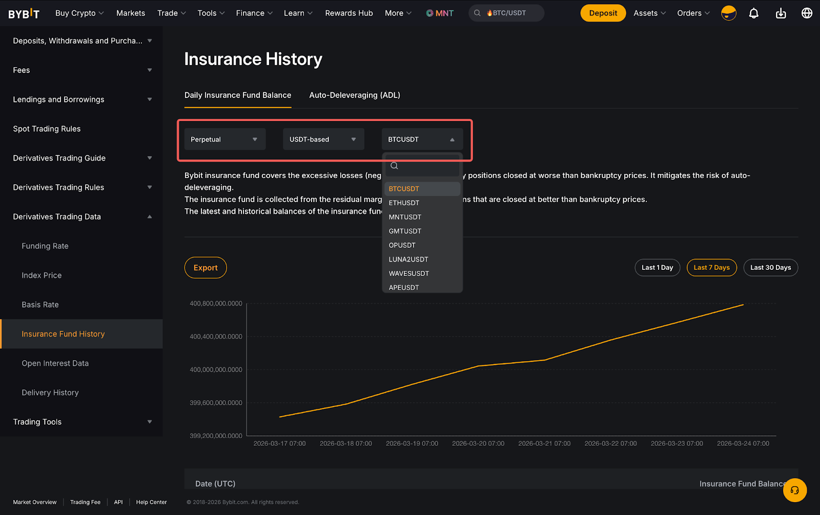 لعرض الرصيد لصندوق التأمين لـ Bybit لجميع العقود الدائمة وعقود الاستحقاق، توجه إلى نظرة عامة على سوق Bybit واختر سجل صندوق التأمين.