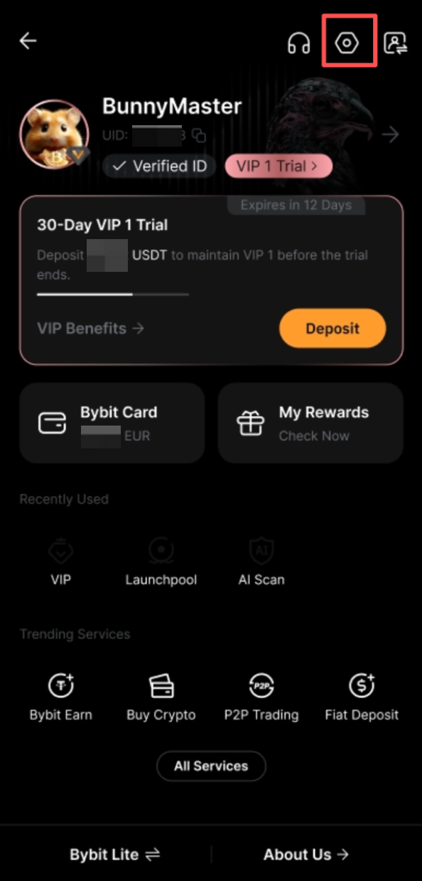 الخطوة 1: افتح تطبيق باي بت، انقر على صورة ملفك الشخصي في الزاوية العلوية اليسرى، ثم انقر على أيقونة الإعدادات لفتح مركز المستخدم.