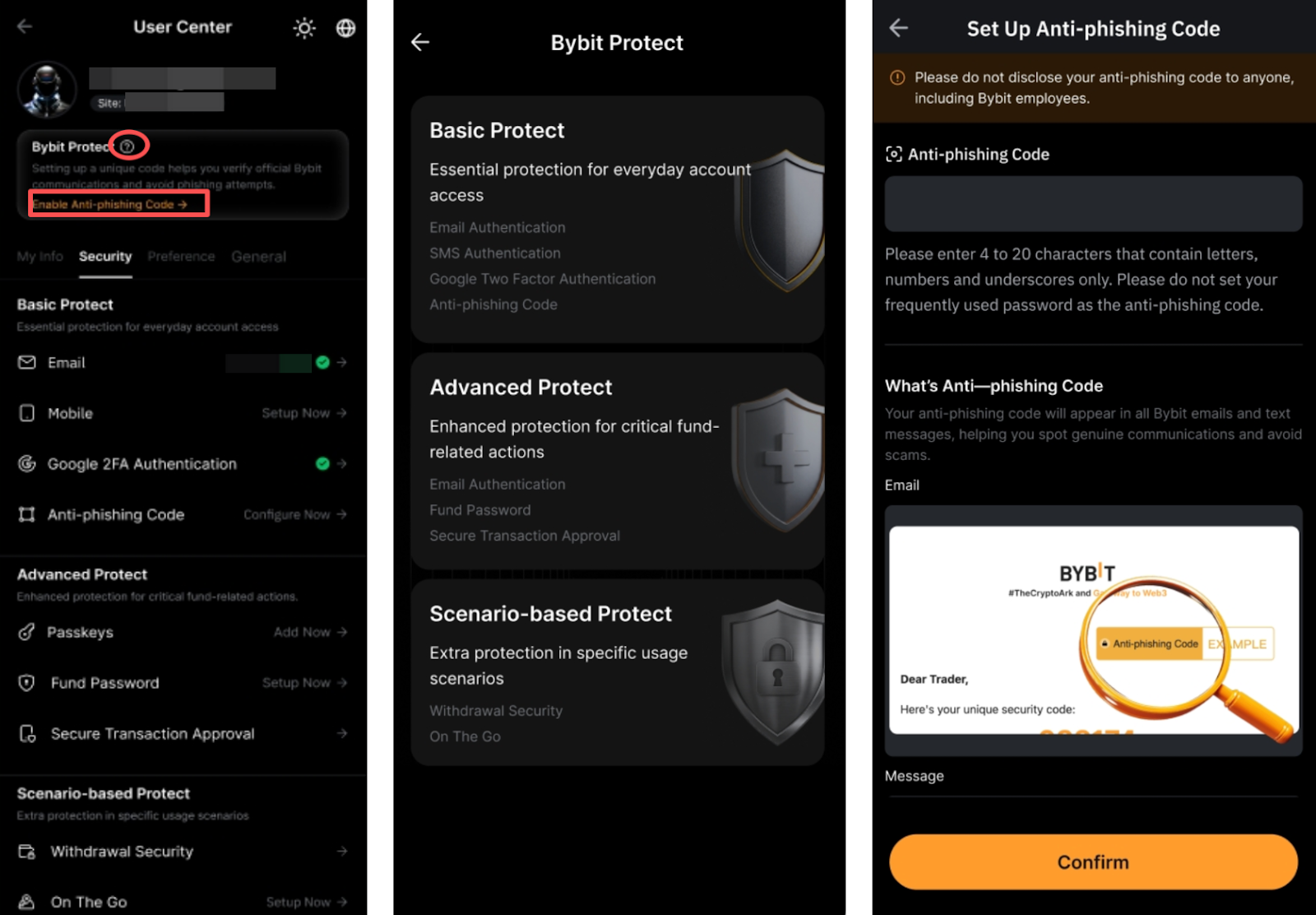 بمجرد التمكين، سيتم تضمين رمز الحماية ضد التصيد في جميع الرسائل الإلكترونية والرسائل النصية الرسمية المرسلة من قبل Bybit. يساعدك ذلك في تحديد الاتصالات الشرعية من Bybit وتجنب محاولات التصيد. لمزيد من التفاصيل، يرجى الرجوع إلى كيفية إعداد رمز الحماية ضد التصيد.