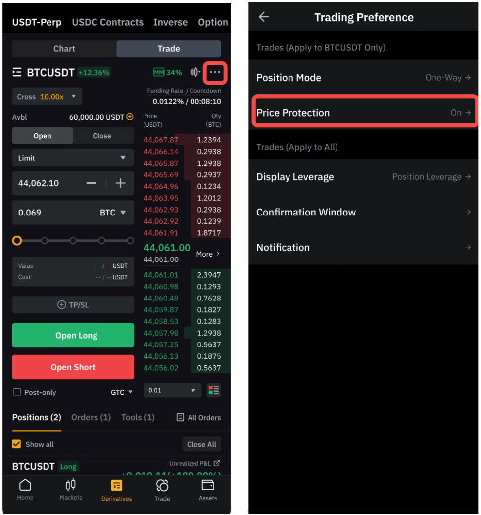 Each trading pair has a corresponding Price Protection threshold. Users can decide whether to enable the Price Protection function for selected or all trading pairs.