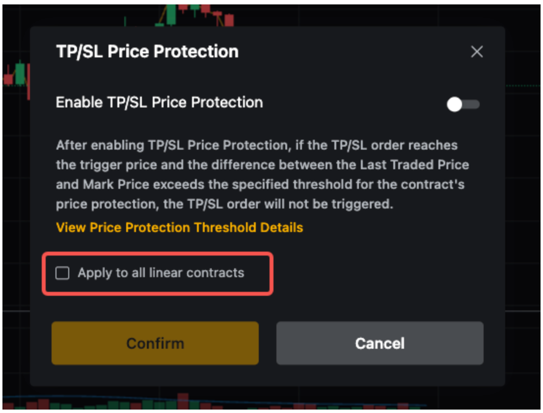 TP/SL Price Protection is specifically designed for setting TP/SL using the Last Traded Price (LTP) as the trigger reference price on Perpetual and Futures Contracts. The Price Protection settings will not apply to TP/SL orders using Mark Price or Index Price as the trigger reference. Orders placed via API won’t be affected by the Price Protection function.