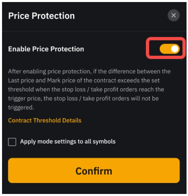 Step 3: If you want to apply Price Protection to all symbols, choose Apply to All Symbols. Please note that this is only supported for USDT Perpetual.