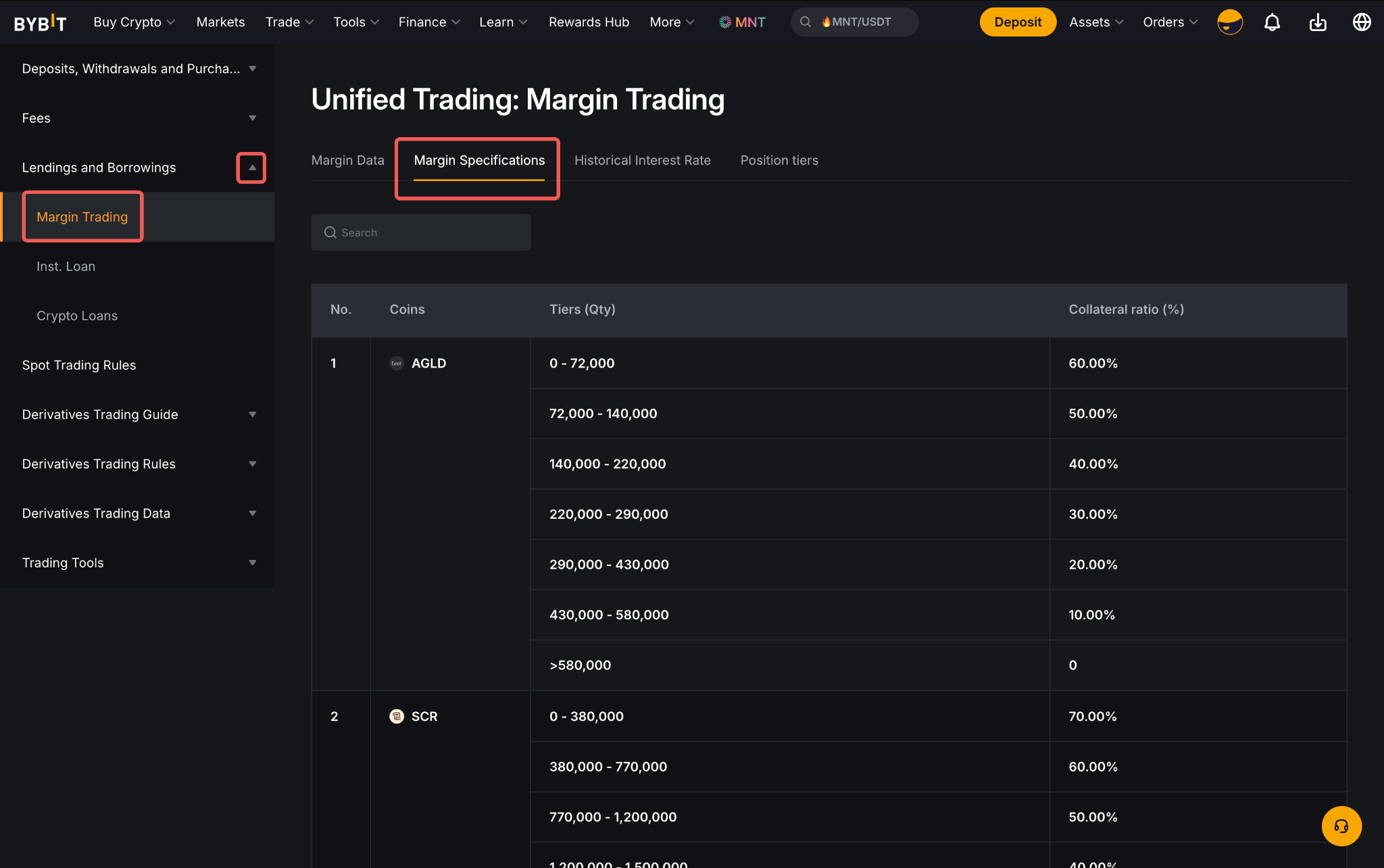 To view the collateral and borrowable asset details, go to the Derivatives Trading Page and click on Derivatives Info. Then, click Lending and Borrowings → Margin Trading → Margin Specification.