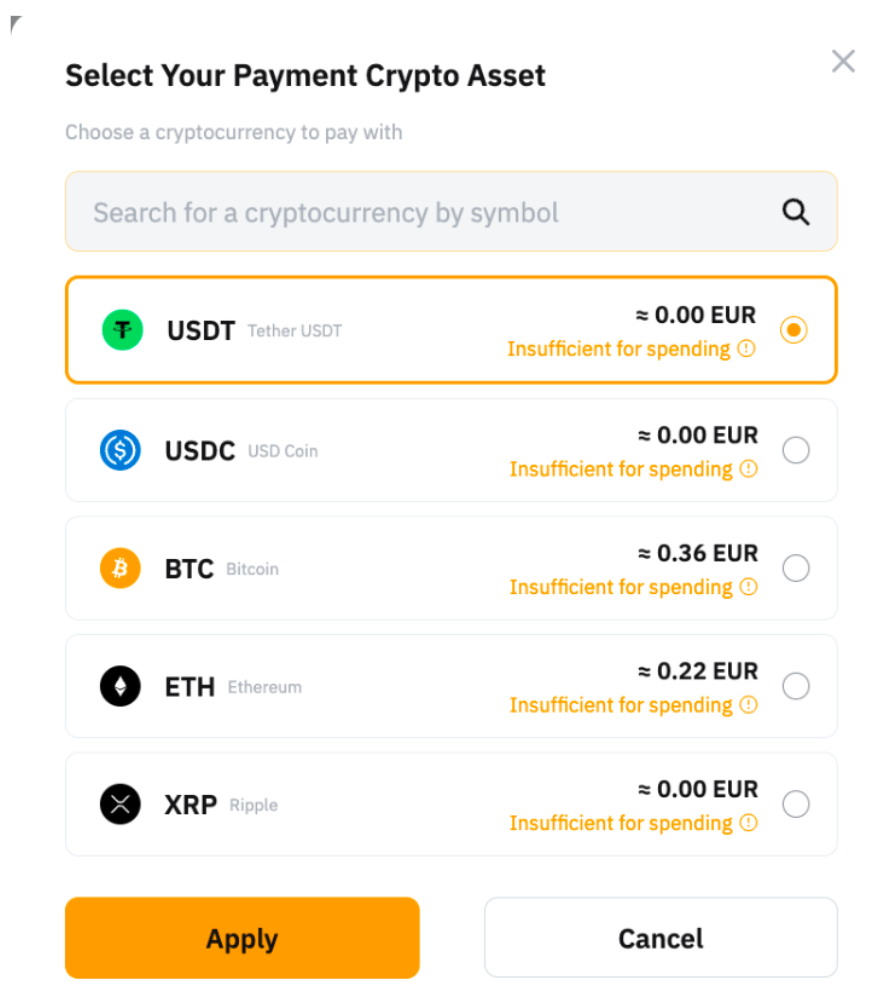 You can select up to 3 types of payment crypto for your Bybit Card transactions and the default payment priority is USDT > USDC >  BTC. However, you can manage your spending currencies, including adding, removing, or changing the order on the Card Dashboard page.