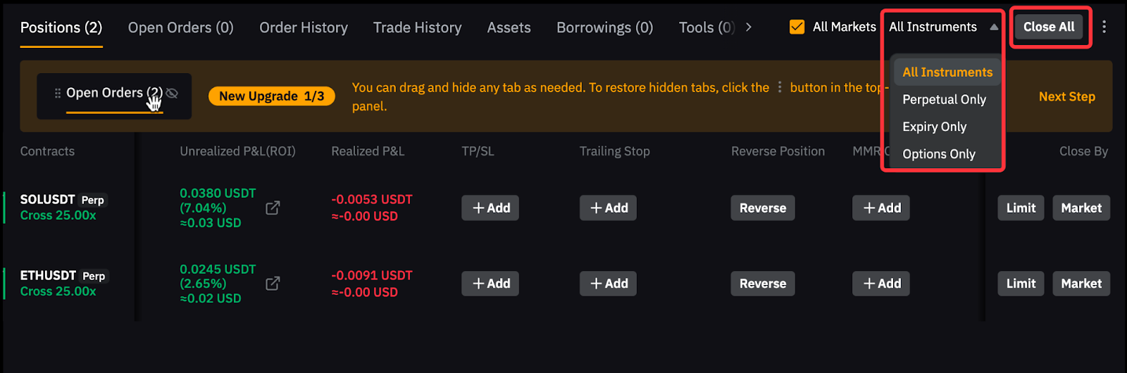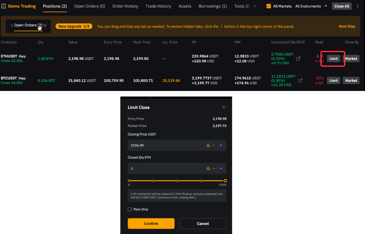 For example, to close a 1 BTC long position, place a 1 BTC short market order. Please note that if the order quantity exceeds your current position size, a new position in the opposite direction may be opened.