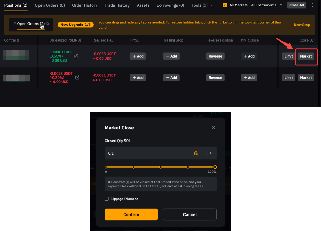 In the Positions tab, select Market under Close By. Enter the quantity you wish to close — partial position closures are supported. The Slippage Tolerance setting allows you to input the maximum price difference you're willing to accept for your market order, based on the Ask1 price for buys and the Bid1 price for sells.