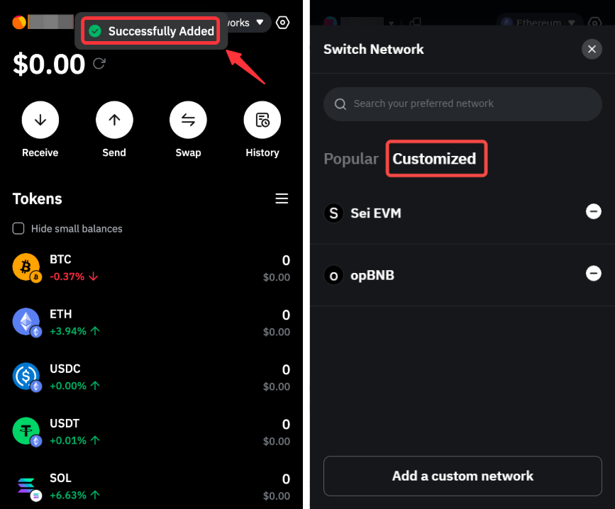 La red se añadirá correctamente a tu billetera Bybit. Puedes ver todas tus redes personalizadas en la pestaña Personalizado de la página Red.