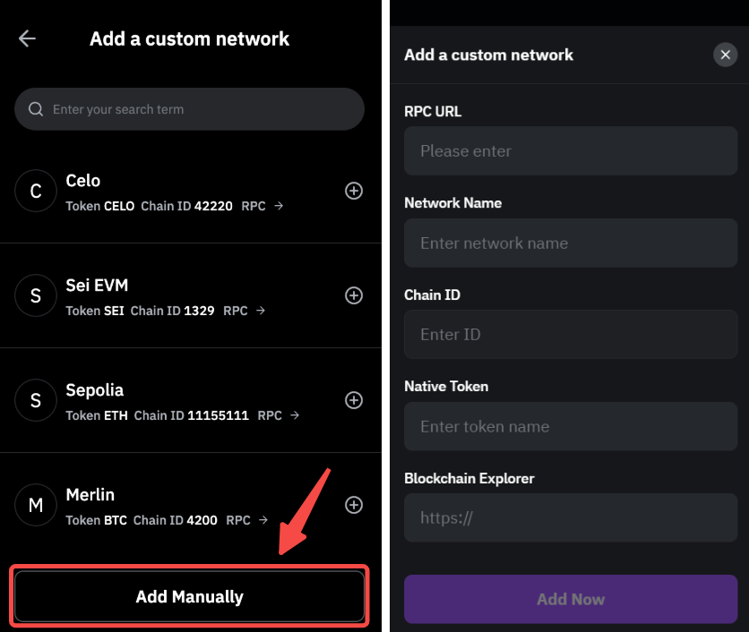 Paso 2: Introduce un nombre de red válido y, una vez que hayas encontrado la red, toca el icono + para añadirlo a tu billetera.