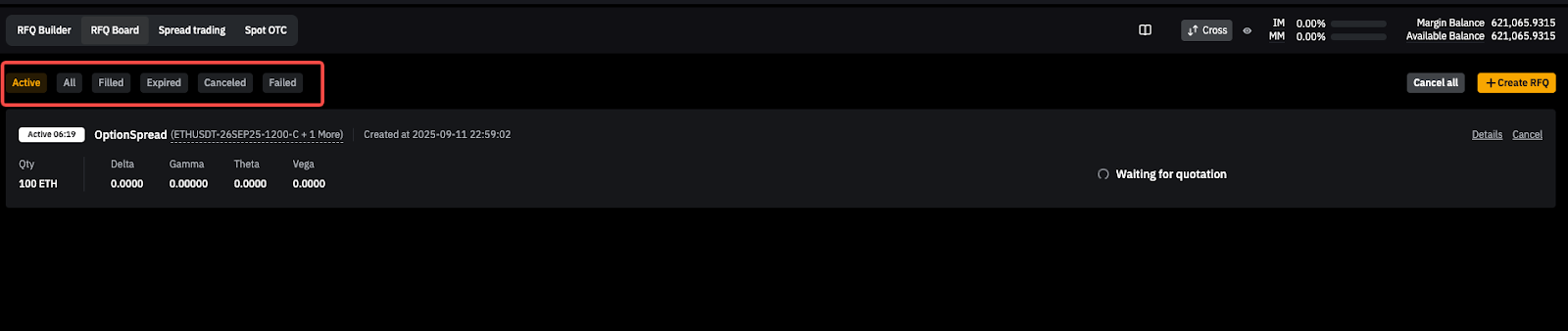 En la parte inferior de la página de trading por RFQ, encontrarás: