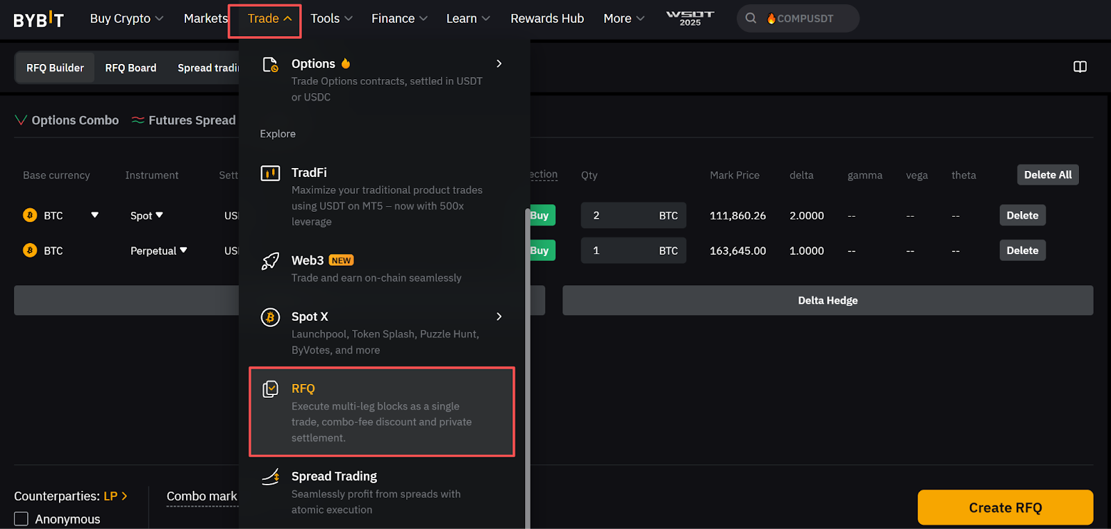 Paso 1: Inicia sesión en el sitio web de Bybit y haz clic en Trade → RFQ en la barra de navegación para acceder a la página de RFQ.