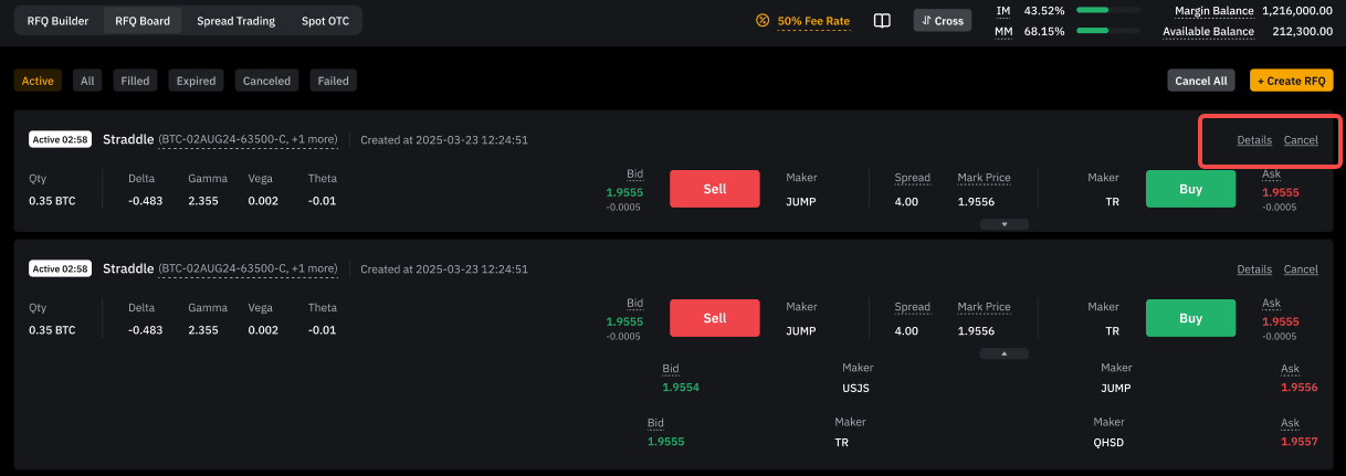 — En la pestaña Ejecutada, puedes hacer clic en Cierre de RFQ para crear una RFQ con etapas en la dirección opuesta y con la misma cantidad de tu posición actual. También puedes hacer clic en Reenviar para volver a enviar la misma RFQ.
