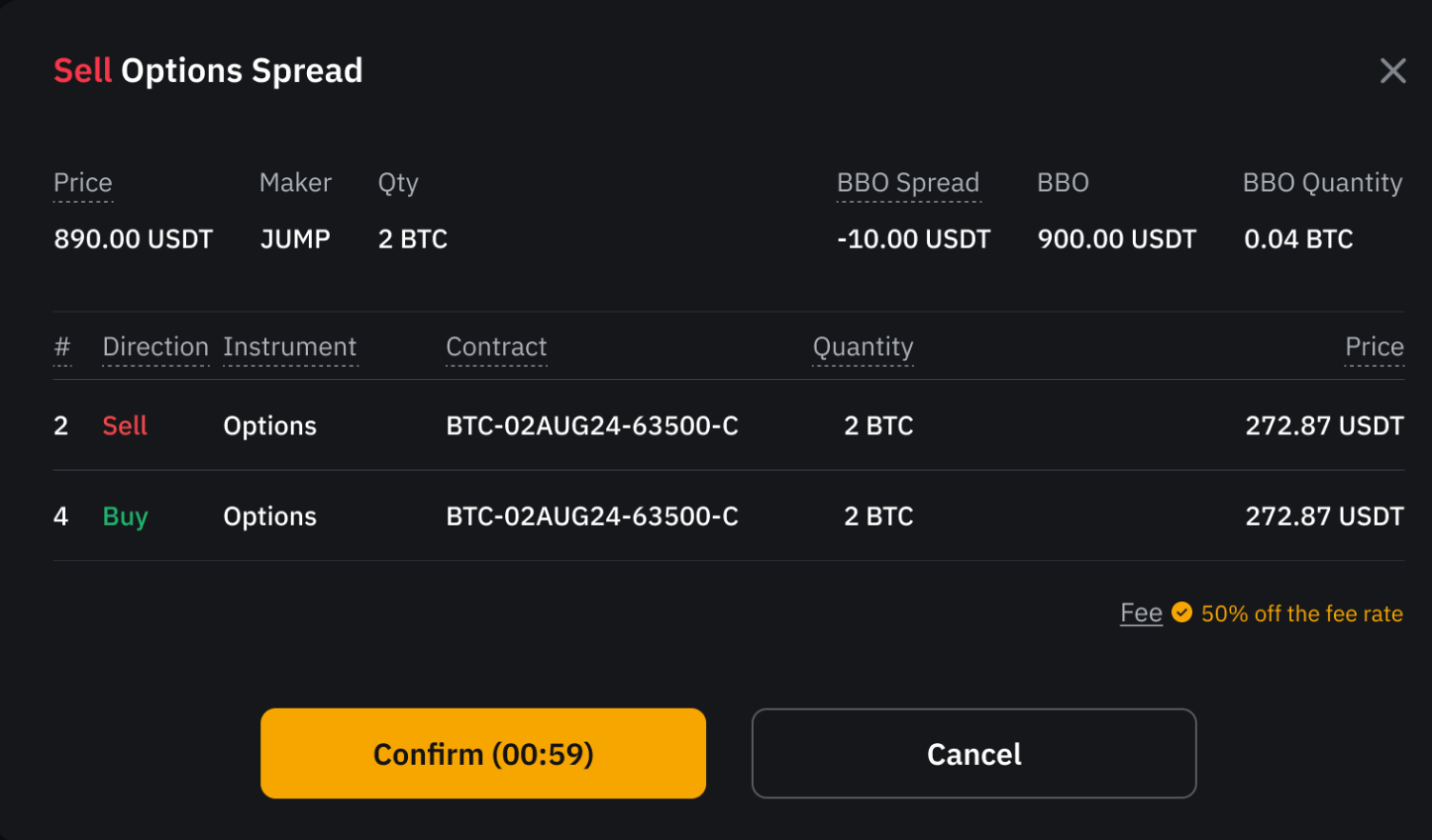 Paso 3: Aparecerá una ventana de confirmación. Revisa los detalles de la cotización, incluyendo el precio, el Maker y la cantidad, y luego haz clic en Confirmar para ejecutar el trade o en Cancelar para descartarla.