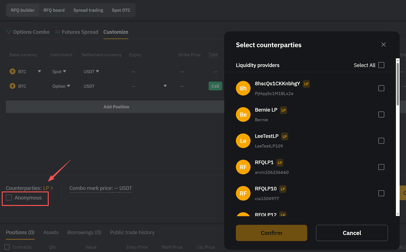 Paso 6: Después de configurar tu estrategia, haz clic en LP en la parte inferior izquierda para seleccionar una o más contrapartes. Para garantizar la máxima confidencialidad, marca la casilla Anónimo.