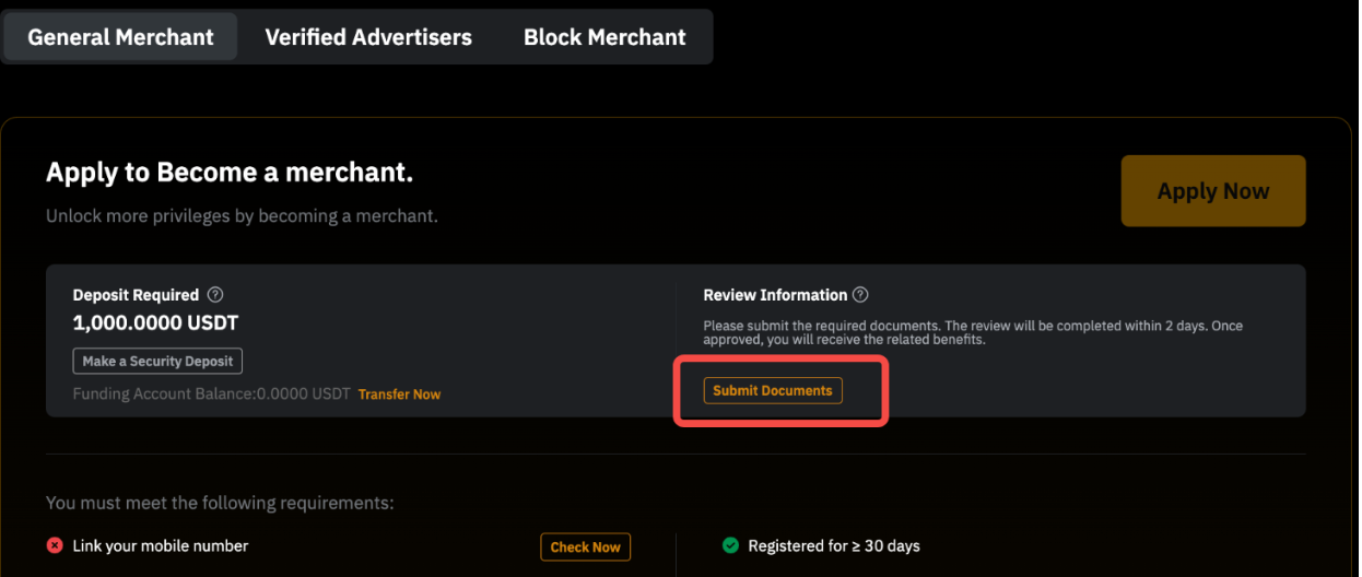 To enhance the security of P2P trading, users identified as potential risks through our comprehensive system evaluation are required to provide a security deposit. These users must provide the required amount and lock it on our P2P platform to maintain their P2P advertising privileges. Please refer to this FAQ for more information.