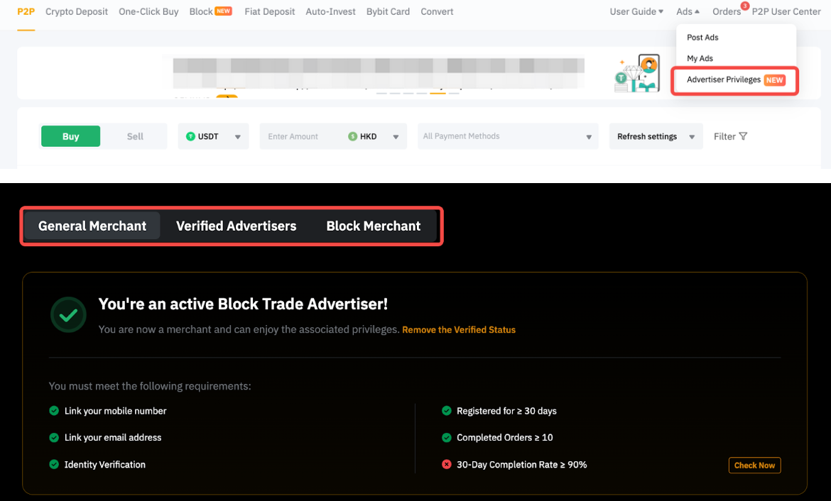 Step 1: Go to the Advertiser Privileges page on the Bybit Website, scroll to the bottom, and select the type of advertiser you want to be.