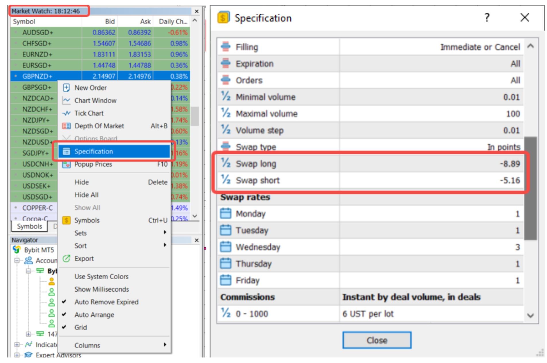 スワップ手数料(オーバーナイト手数料またはロールオーバー手数料としても知られています)は、それぞれの契約に対して課されます以下のガイドに従って、MT5クライアントターミナル内の契約仕様書を参照できます。
