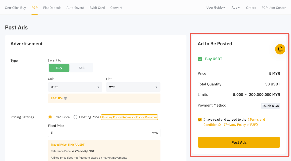 Here’s a detailed step-by-step guide on how you — as an advertiser — can post your first P2P advertisement on Bybit.