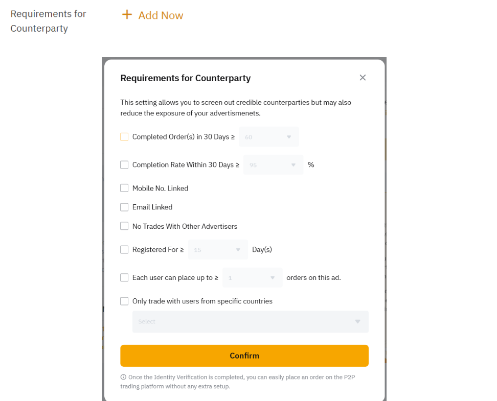 If you would like to set up requirements for your ad’s counterparty, click on Add Now and you will be prompted to select your preferred requirements.