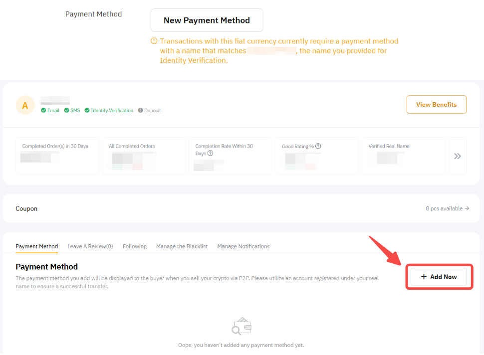 Click on Manage Payment Method and you will be directed to the P2P User Center to add your payment method.