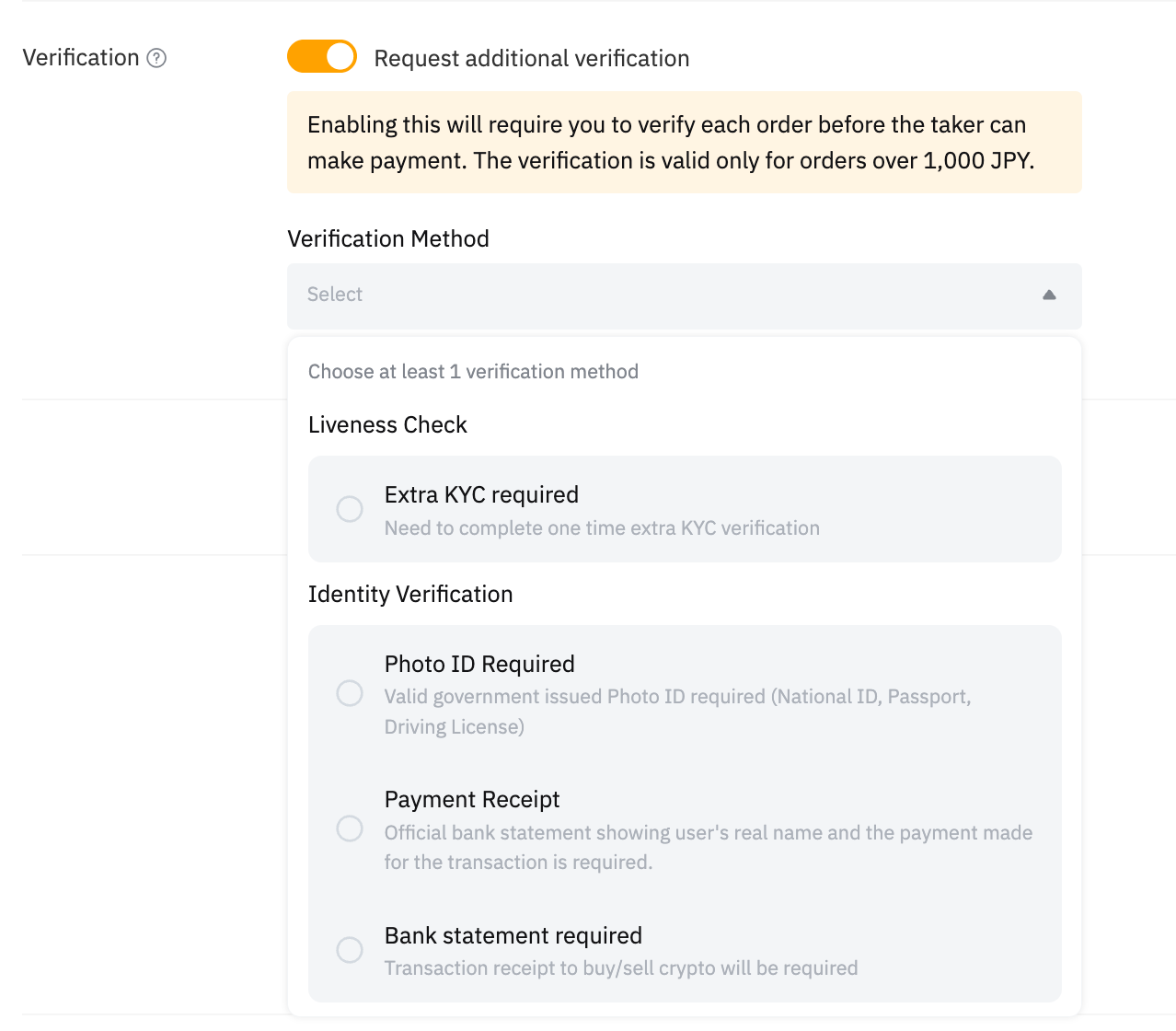 When the Verification Requirement is enabled by the Verified Advertiser (VA) and Block Advertiser (BA), takers are required to complete verification with the advertisers when the order exceeds the specified threshold of fiat currency. Both parties have the right to decide whether to proceed with the transaction during the verification period within the timeframe. Advertisers may request the following proof from the taker in the Order Chat Box: