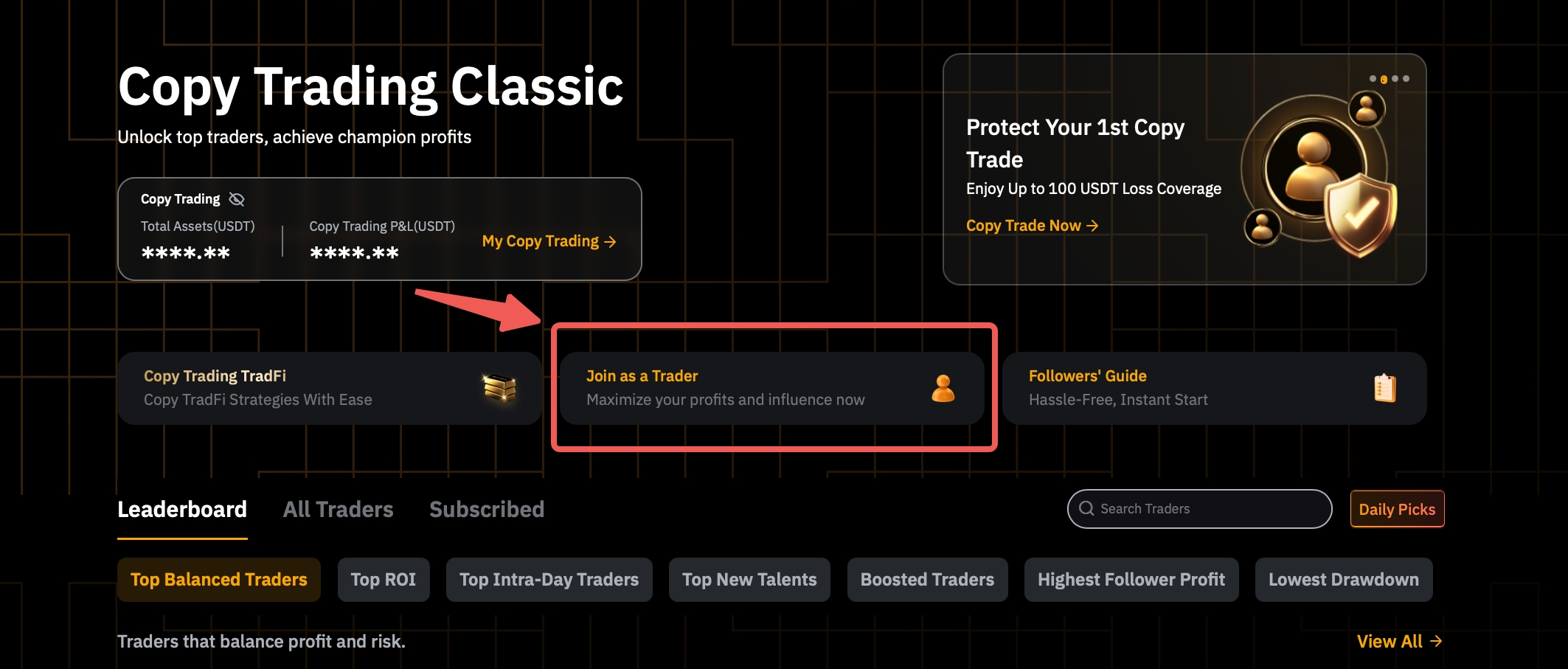 Step 3: Click on Join as a Trader to enter the Master Trader application page. Please note that you will be able to select Join as a Trader from your Main Account, the system will auto-create a Standard Subaccount as your Master Trader Account after the application is completed.